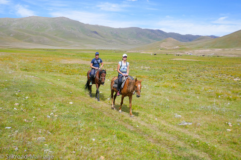 Das nächste Ziel steht bei fast allen Touristen auf dem Programm: es geht zum Song Kul. Der riesige See liegt in einer Hochebene auf 3016 Metern und bietet unendliche Möglichkeiten, um einen schönen Stellplatz zu finden. Wir fahren an der großen touristischen Jurten-Siedlung gleich am Anfang des Sees vorbei und stellen uns mit tollem Weitblick auf eine Anhöhe. Der Sonnenuntergang zaubert wieder einmal grandiose Farben an den Himmel und leitet in eine kalte Nacht über. Die Saison ist kurz und die Einheimischen leben hier oben nur etwa 3-4 Monate in ihren Jurten. Charlotte und Celine setzen sich am nächsten Tag mit ihrem Wunsch durch, endlich wieder einen Tag auf dem Pferd zu verbringen. Fast bei jeder Jurte kann man für kleines Geld Pferde mieten und so reiten wir zu dritt in eines der Seitentäler. Nach ca. 2 Stunden drehen wir um. Frederiks Hintern tut weh und Charlotte und Celine wollen ihn bei seinem ersten Reitversuch nicht weiter quälen. Nachdem wir die Pferde wieder ihren Eigentümern zurückgebracht haben, verlassen wir die Hochebene über eine lange Schotterpiste.