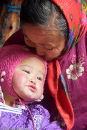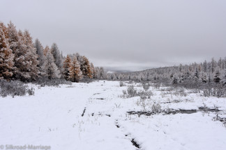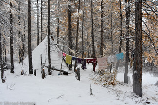 Wir werden als erstes in eins der Tipis zum obligatorischen Tee eingeladen und erkunden danach die Gegend. Einige der sehr zutraulichen Tiere laufen frei umher, viele andere sind zwischen den Tipis an Bäumen angebunden. Gamba, der Stammesführer, und seine Frau nehmen uns sehr herzlich auf. Da das Gästetipi belegt ist, dürfen wir bei Ihnen im Tipi schlafen. Wir verbringen einen sehr netten Abend und kommunizieren mit Händen und Füßen. Als wir bereits in unseren Schlafsäcken liegen deckt uns Gambas Frau noch ganz liebevoll mit zwei Decken zu. Sie möchte sicher gehen, dass wir nicht frieren. Mit im Tipi übernachtet noch ein Pferdeführer (zum Glück nicht unserer). Dieser hat leider zu tief in seine Wodkaflasche geschaut, sodass wir eine sehr unruhige Nacht verbringen. Am Morgen werden wir sofort dafür entschädigt. Es hat über Nacht geschneit und die Umgebung hat sich in eine traumhafte Winterlandschaft verwandelt. So haben wir doch tatsächlich Glück und sowohl den Indian Summer, als auch die Winterlandschaft hier oben gesehen. Wir werden uns wohl immer an diese netten und stolzen Menschen und die wunderschönen Rentiere erinnern.
