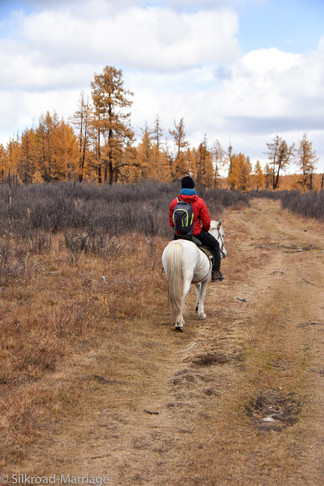 Nach einer kühlen Nacht vor der Jurte, packen wir unsere Sachen für den Ritt zu den Tsaaten. Wir haben Glück mit dem Wetter und die Wälder leuchten in grandiosen Herbstfarben. Der Indian Summer hier könnte nicht schöner sein. Im Winter haben die Tsaaten ihre Zelte wesentlich weiter unten in den Wäldern der mongolischen Taiga aufgeschlagen. Wir erreichen ihr aktuelles Camp daher schon nach drei Stunden auf dem Pferd. Kurz bevor wir die Tipis sehen, kommen bereits die ersten Rentiere an uns vorbei gelaufen.