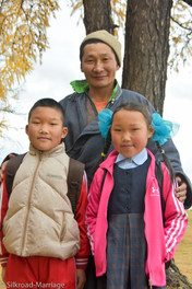 Der erste Teil der Piste ist wieder schnell fahrbar und geht durch die hügelige Landschaft um Morön. Dann geht es aber so langsam in die Berge. Der Track ist einfach zu finden und wir schlängeln uns immer weiter hinauf. Nachdem der Landy schon auf dem Weg nach Morön einige Male durchgeschlagen ist, wird das Fahrverhalten auf dieser Piste immer schlechter. Die Stoßdämpfer an der Hinterachse haben wohl den Dienst quittiert. Weiter geht's also munter schaukelnd über die immer schlimmer werdenden Wellen. Irgendwann sehen wir einen der typischen kleinen UAZ Busse aus Russland auf einer Piste weiter rechts vorbeiziehen. Die lokalen Fahrer scheinen einen schnelleren Weg zu kennen... Wir folgen dem kleinen Bus noch bis Ulaan Uul. Die Sonne ist gerade untergegangen und wir parken neben der großen freien Fläche, die den Ort durchzieht. Am nächsten Morgen laufen die Kinder am Landy vorbei zur Schule. Auch der "neue Nachbar" stattet uns einen Besuch ab. Seine Kinder sind ebenfalls auf dem Weg in die Schule, müssen aber erst noch schnell für ein Foto posieren. Es ist nicht das erste Mal, dass uns Einheimische hier dazu auffordern, doch ein Foto von ihnen zu schießen.