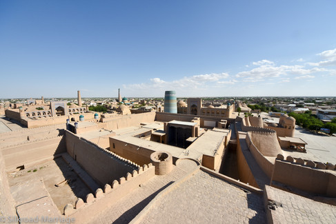 Als erstes geht es in die nahe gelegene Stadt Nukus. Wir brauchen Bargeld. Die Kapital Bank ist die einzige Bank in Nukus, bei welcher wir Dollar mit unserer Visa Karten abheben können. Die Suche gestaltet sich allerdings schwieriger als erwartet. Nach einiger Kurverei durch die Stadt finden wir sie schließlich und haben endlich wieder Dollar. Der offizielle Wechselkurs weicht in Usbekistan stark vom Schwarzmarkt-Kurs ab, daher wechseln wir nicht in der Bank. Beim Verlassen der Bank kommen wir mit einem Tourguide ins Gespräch. Wir unterhalten uns ein wenig über die Touren zum Aral See, die er organisiert. Als wir uns verabschieden, kommen uns die restlichen Turkmenischen Manat in den Sinn. Auf die Frage, ob wo wir Mandat wechseln können, heißt es zuerst, dass Manat hier wenig beliebt seien. Selbst für Usbeken sei ein turkmenisches Visum schließlich nur schwer zu bekommen. Nach einem kurzen Telefonat erhalten wir einen sehr guten Kurs für unsere Dollar und sogar für unsere Mandat. Glück gehabt! Mit lokaler Währung in der Tasche fahren wir zum Museum of Art. Auf dem Parkplatz hält ein weiterer Landy mit russischem Kennzeichen, den wir bereits unterwegs gesehen hatten. Roman und Marek sind unterwegs durch Zentralasien und haben sich letztes Jahr in der Mongolei kennen gelernt. Roman spricht fließend Deutsch, da er in Konstanz studiert hat. Natürlich unterhalten wir uns ein wenig und Roman kommt mit uns ins Museum. Nach dem Besuch im Museum machen wir uns auf nach Khiva. Am Guest House Alibek soll man gleich neben der Altstadt stehen können. Hier steht schon ein Unimog mit italienischem Kennzeichen. So ist die Sache klar: Hier bleiben wir! Pierino und Oriella sprechen zwar eigentlich nur italienisch, aber irgendwie verstehen wir sie. Die Beiden haben in den letzten 10 Jahren mehr oder weniger alles in Europa, Zentralasien und Nordafrika abgefahren. Am nächsten Tag geht es für uns in die Altstadt. Die Stadtmauer ist noch größtenteils intakt und die Gebäude gut restauriert. Da hier immer noch einige hundert Menschen leben, ist es weniger touristisch als erwartet. Es erinnert uns ein wenig an Yazd und wir genießen den Spaziergang durch die kleinen Gassen. Dabei entdecken wir das Restaurant Terrassa, das seinem Namen mit zwei tollen Dachterrassen alle Ehre macht. Als wir das gute Essen genießen, kommt der Eigentümer zu uns an den Tisch. Er spricht fast akzentfrei Deutsch, da er seit 17 Jahren Deutsche Reisegruppen in Usbekistan leitet. Das Restaurant hat er erst im März 2017 eröffnet. Wir können einen Besuch dort nur empfehlen! Pierino und Oriella fahren weiter, dafür kommen Ines, Dundee und Peter mit einem weiteren Landy und einem Land Cruiser zum Guesthouse. Kurz gefolgt von Roman und Marek. Ines und Dundee fahren einen sehr schön umgebauten 130er und so gibt es natürlich viel zu erzählen.